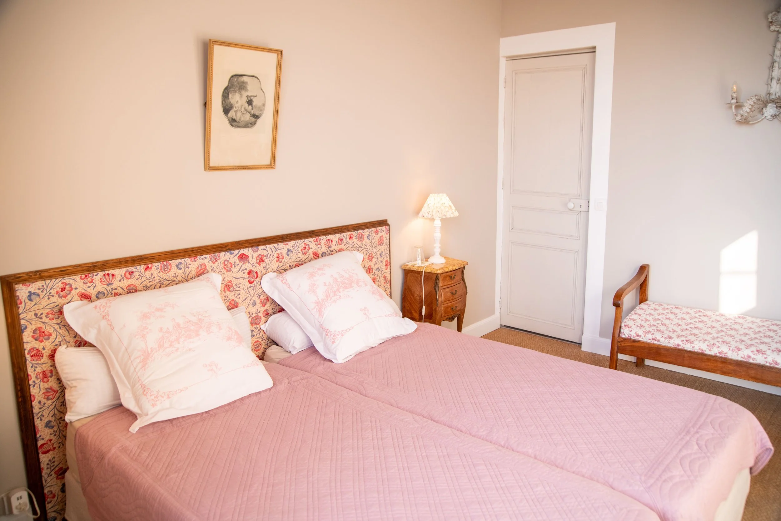 Belle et grande suite familiale ≃50 m2, au 2ème étage du château, Lou Casteï réunit une chambre spacieuse avec deux fenêtres sur la terrasse, équipée d’un lit double (190x160) et une deuxième chambre séparée par une porte, avec une fenêtre sur les collines, équipée de deux lits simples. Dans la grande chambre, chaux tirée, coloris « Calcaire », sol en jonc de mer et mobilier vintage, salle de bains avec douche et toilettes. Dans la deuxième chambre, deux lits simples à baldaquin (190×80) et un cabinet de toilette.